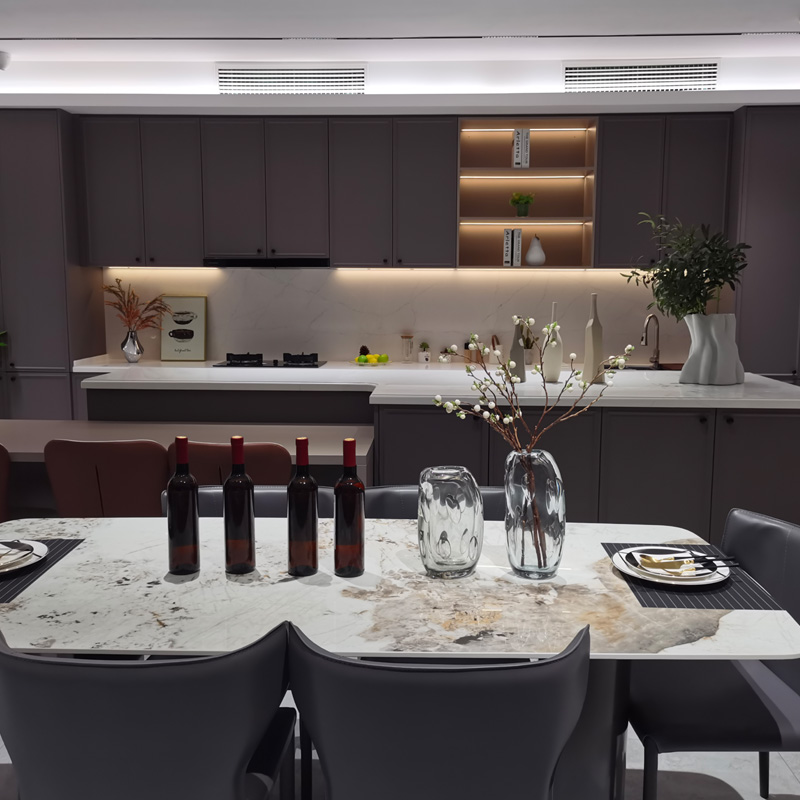 Matbrun farve klassisk køkkenskab med formet dørpanel design, føles som hud ved berøring. nem vedligeholdelse og kan matches med forskellige boligdekorationer.