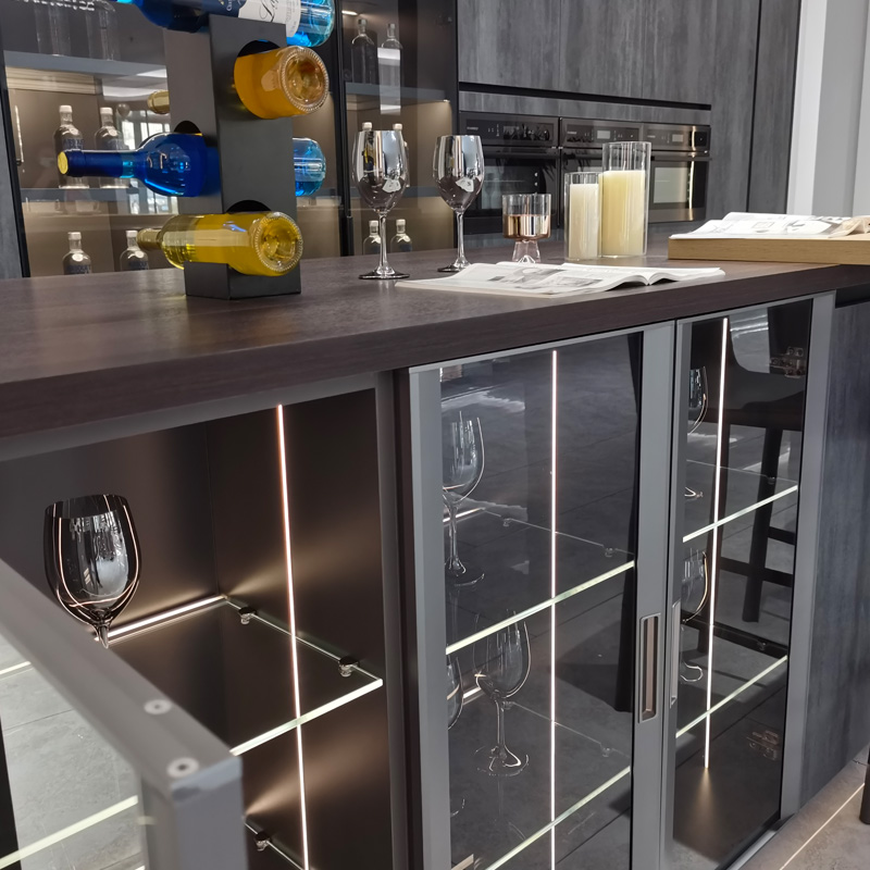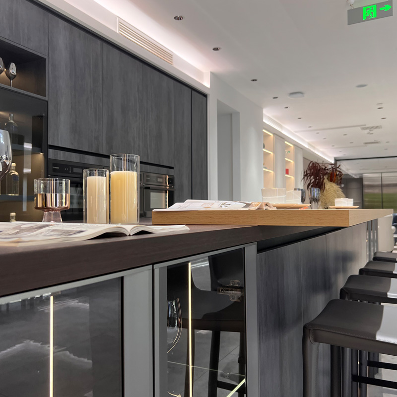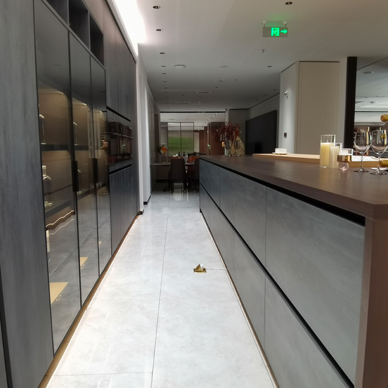 Ny stil fashionabelt industrielt lamineret køkkenskab med farve gammel behandling som klippeforvitring, berøringsfølelse er glat og kvalitet, matchende glasdørpanel med aluminiumsramme, gør den høje følelse af køkkenindretningseffekt. Materialet er vandtæt, let at rengøre, og stilen er ikke let at få ud.