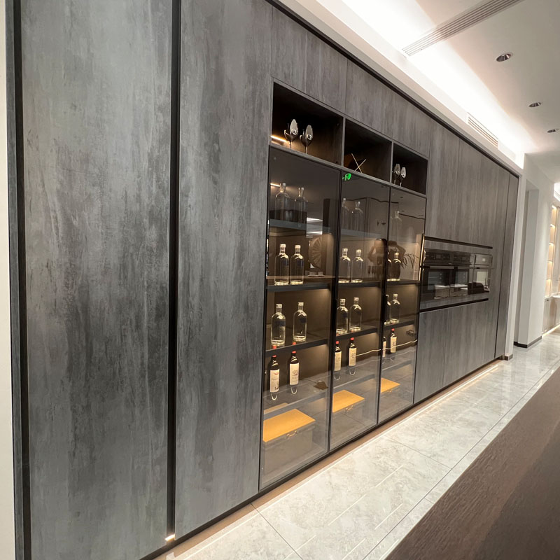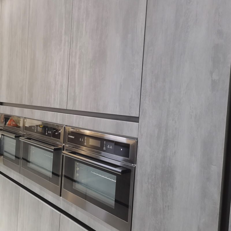Ny stil lamineret køkkenskab med farve gammel behandling som klippen forvitring, berøringsfølelse er glat og kvalitet, matchende glasdørpanel med aluminiumsramme, gør den høje følelse af køkkenindretningseffekt. Materialet er vandtæt, let at rengøre, og stilen er ikke let at få ud.