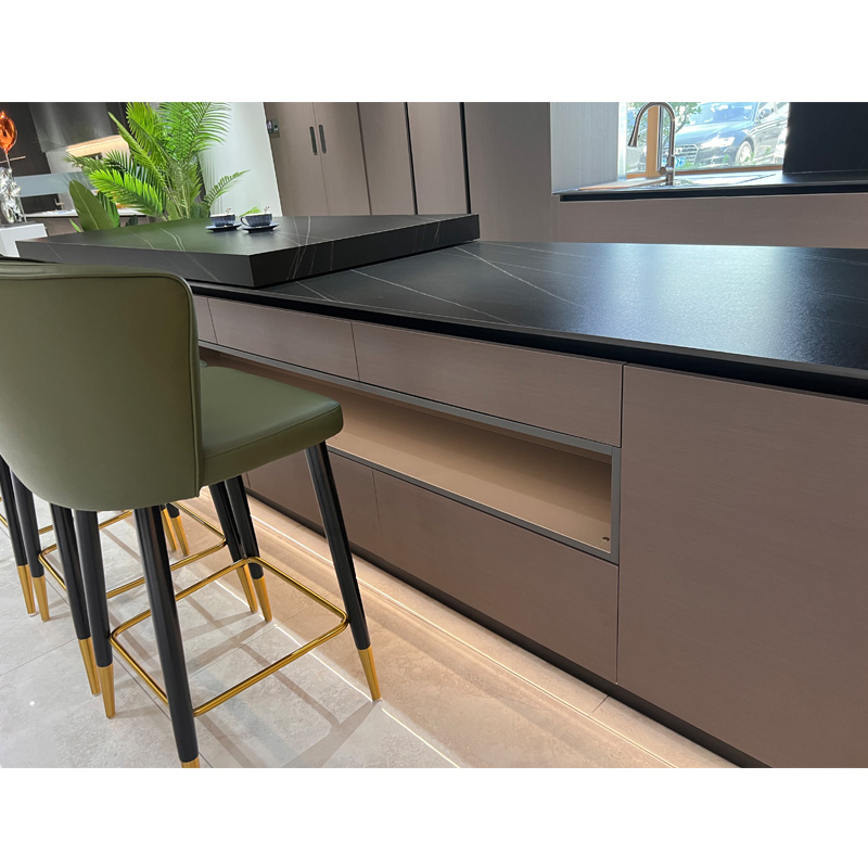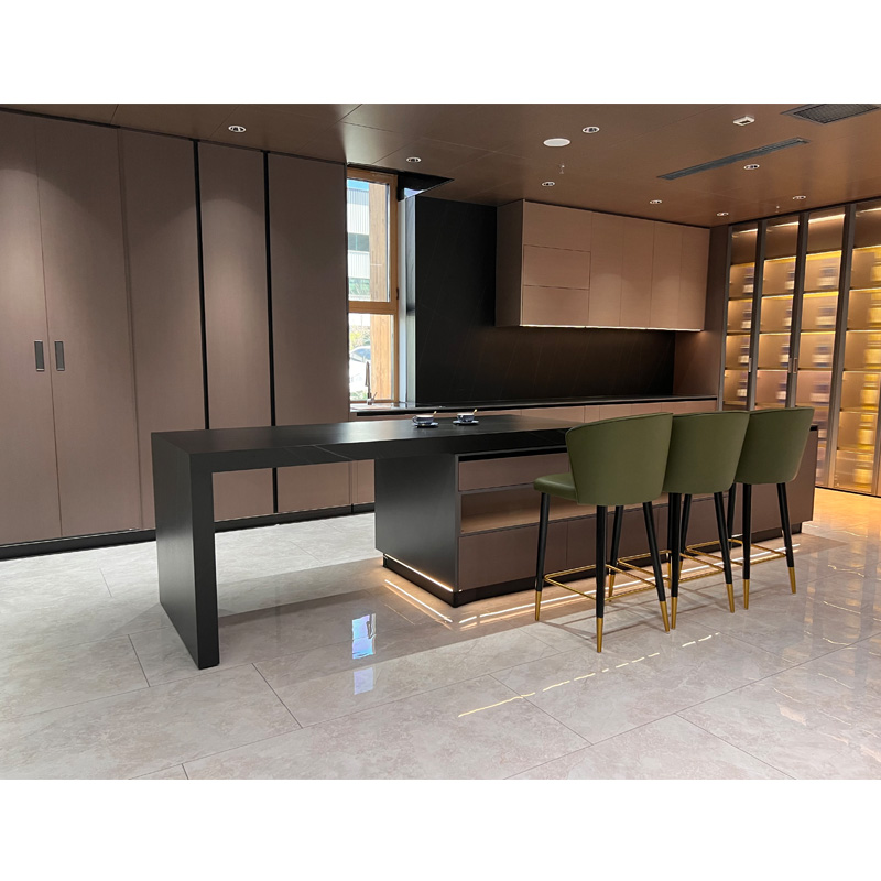 Disse smarte køkkenskabe i l-form luksuskøkkenskabe med glas køkkenskabe, de brune køkkenskabe og glas køkkenskabe passer fantastisk i designet til at give dig en let luksusoplevelse, når du laver mad. Pantry skabe er optimeret til at indeholde alle dine køkkendragter .