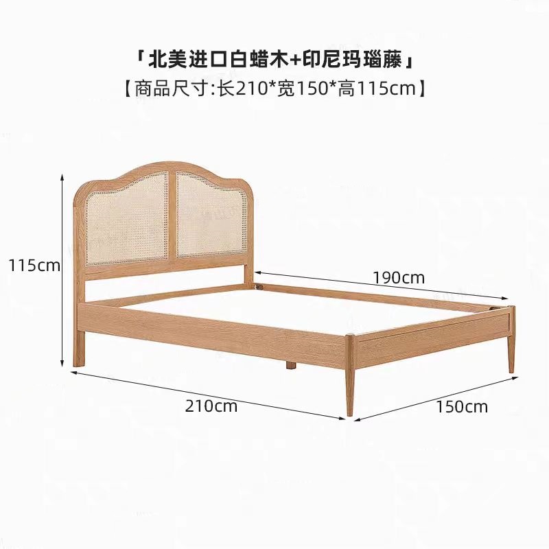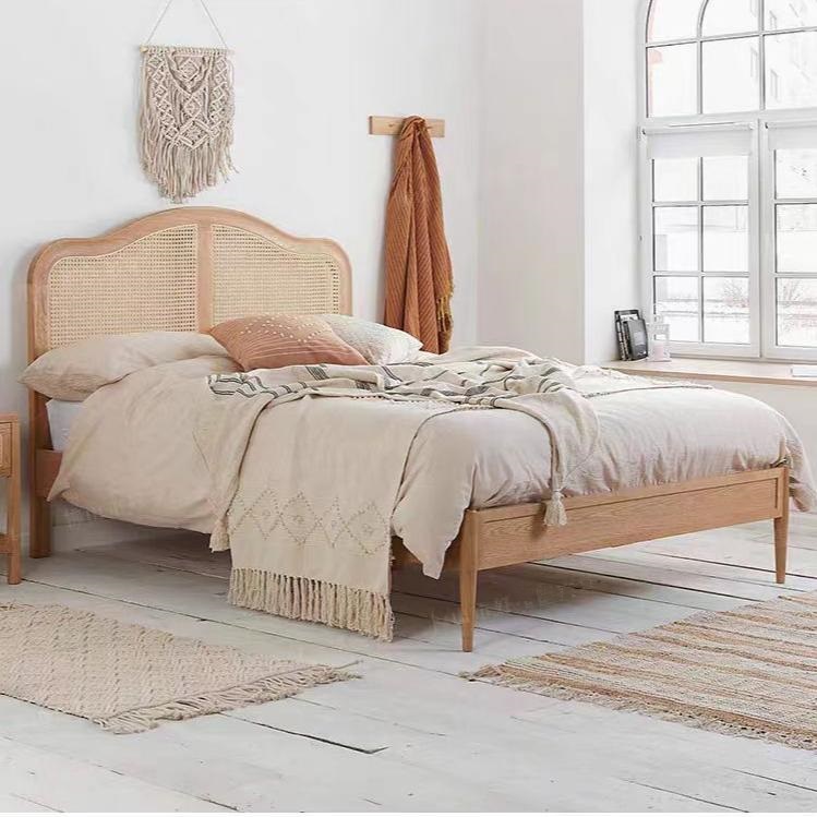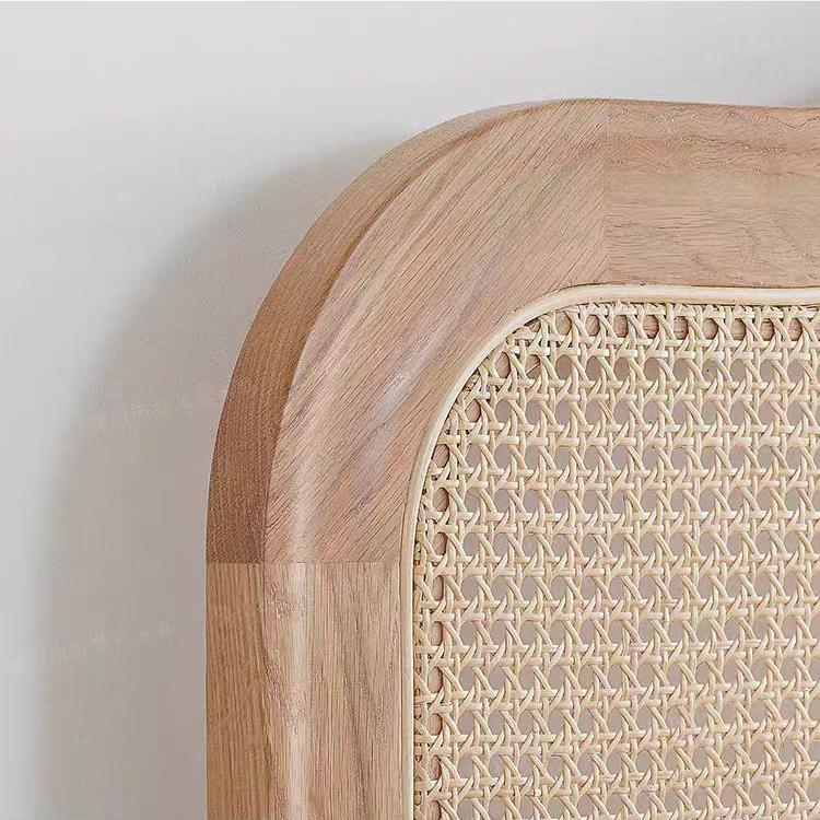 I hjertet af denne sengs appel ligger sit valg af premium -materialer. Vælg den robuste og elegante røde eg, det lys og den alsidige nordamerikanske hvide eg eller den varme og indbydende hvide aske. Hver træstype bringer sit unikke korn og tekstur og tilføjer et strejf af naturens skønhed til dit soveværelse. Det vævede hovedgærde, der er udformet af den indonesiske Manau -rotting, tilføjer et lag af tekstur og dybde, der forbedrer sengenes rustikke charme.